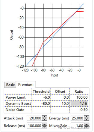 DRC在音頻算法中是非常核心的模塊,英文全稱dynamic range control,作用是調(diào)整音頻信號的動(dòng)態(tài)范圍,根據(jù)輸入信號的大小自動(dòng)調(diào)整增益;究梢缘脑O(shè)置參數(shù)如下:
