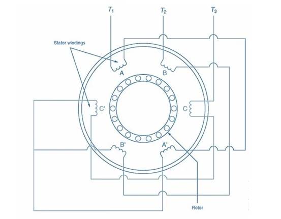 要反轉(zhuǎn)鼠籠式電機(jī)的旋轉(zhuǎn)方向,只需互換三個(gè)定子引線中任意兩個(gè)的連接即可。通常,T1 和 T3 可以互換。這將導(dǎo)致定子中的旋轉(zhuǎn)磁場(chǎng)沿相反方向旋轉(zhuǎn)。轉(zhuǎn)子將沿旋轉(zhuǎn)磁場(chǎng)的新方向轉(zhuǎn)動(dòng),該方向與原始方向相反。