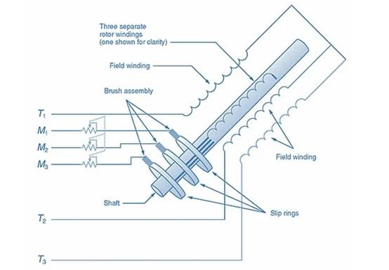 同步電機(jī)(如圖 5 所示)具有三相定子、繞線轉(zhuǎn)子、滑環(huán)和電刷。然而,與繞線轉(zhuǎn)子感應(yīng)電機(jī)的三個(gè)繞組相比,轉(zhuǎn)子具有單個(gè)繞組。轉(zhuǎn)子還包含類似于鼠籠式電機(jī)轉(zhuǎn)子的短路棒。同步電機(jī)引線對(duì)于定子連接標(biāo)記為 T1、T2 和 T3,對(duì)于轉(zhuǎn)子連接標(biāo)記為 R1 和 R2。直流電源為轉(zhuǎn)子供電。