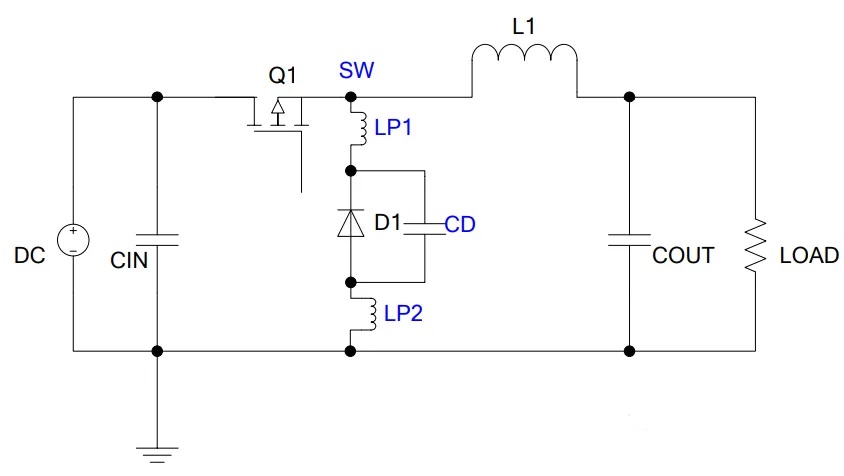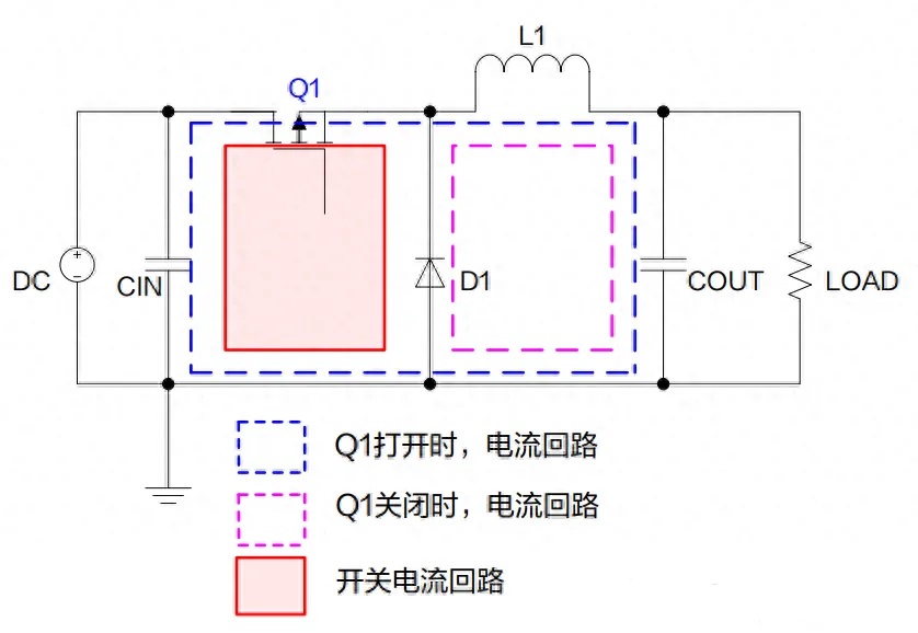 不論功率管 Q1 打開還是關(guān)斷,電流均流過 L1 和 COUT,表明流過 L1 和 COUT 處電流是連續(xù)電流, 流過 CIN、Q1、D1 的電流是開關(guān)電流,開關(guān)電流會在寄生電感上產(chǎn)生毛刺電壓,對外輻射電磁波。