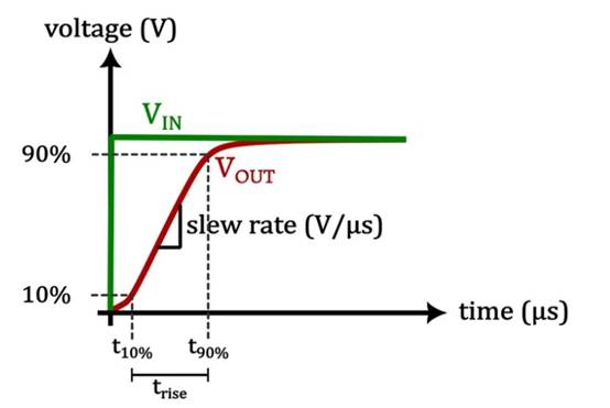 我們可以將上升時(shí)間(上圖中的 trise)定義為信號(hào)從其新值的 10% 增加到 90% 所需的時(shí)間。下降信號(hào)的轉(zhuǎn)換率類似,的區(qū)別是我們現(xiàn)在測量從 90% 下降到 10% 的變化。請(qǐng)注意,本文的其余部分將僅討論上升輸出信號(hào)的轉(zhuǎn)換速率限制。