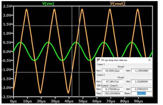 我們使用經(jīng)典的 741 運(yùn)算放大器,其轉(zhuǎn)換速率約為 0.5 V/μs。