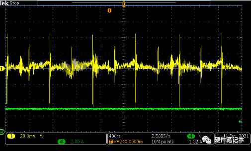 但這仍然不是真正的開關(guān)穩(wěn)壓器的輸出紋波。這是因?yàn)槭静ㄆ鞯奶綔y尖端測量的是EVB板的輸出,其到開關(guān)穩(wěn)壓器的輸出之間的走線存在著寄生電感。