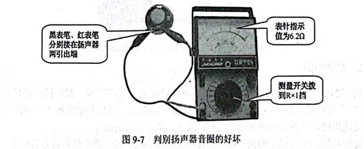 判斷揚(yáng)聲器的好壞,可用萬(wàn)用表電阻擋進(jìn)行檢測(cè)。檢測(cè)時(shí),把揚(yáng)聲器口朝下平放在桌面上,萬(wàn)用表置于R×1擋,兩表筆(不分正、負(fù))斷續(xù)觸碰揚(yáng)聲器或耳機(jī)的兩引出端,如圖9—7所示。揚(yáng)聲器或耳機(jī)中應(yīng)發(fā)出“咯、咯···”聲,聲響越大表明揚(yáng)聲器靈敏度越高;如果發(fā)聲很小,且萬(wàn)用表表針擺動(dòng)幅度也小,則表明性能較差,可能是音圈局部短路(感應(yīng)電勢(shì)下降);如果揚(yáng)聲器無(wú)聲,且萬(wàn)用表表針不擺動(dòng),則可能是引出線斷線或音圈燒斷;若揚(yáng)聲器無(wú)聲,但萬(wàn)用表表針擺動(dòng),則表明音圈引出線是好的,但音圈被卡住而不動(dòng)。