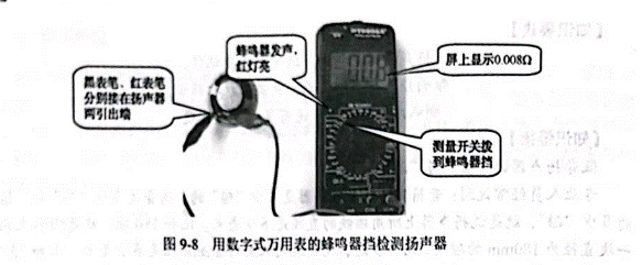 用蜂鳴器擋檢測(cè)揚(yáng)聲器的操作方法如圖9—8所示。將數(shù)字式萬(wàn)用表置于蜂鳴器擋,兩表筆不分正負(fù)分別任意接揚(yáng)聲器的兩個(gè)引出端。若此時(shí)蜂鳴器發(fā)聲,說(shuō)明被測(cè)揚(yáng)聲器正常;若揚(yáng)聲器不發(fā)聲,說(shuō)明音圈斷路。由于揚(yáng)聲器音圈的直流銅阻一般都小于蜂鳴器擋的值電阻,所以測(cè)試時(shí)蜂鳴器能發(fā)出聲響。