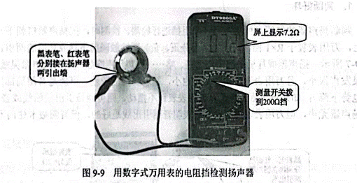 用數(shù)字式萬(wàn)用表的電阻擋檢測(cè)揚(yáng)聲器的操作方法如圖9—9所示。將數(shù)字式萬(wàn)用表置于電阻擋2002量程,將兩表筆接揚(yáng)聲器的兩個(gè)引出端,此時(shí)萬(wàn)用表顯示出被測(cè)揚(yáng)聲器的直流銅阻,此值與揚(yáng)聲器的阻抗有關(guān)。一般電動(dòng)揚(yáng)聲器的直流銅阻約為其標(biāo)稱阻抗的80%~90%。如果檢測(cè)時(shí)萬(wàn)用表顯示溢出符號(hào)“1”,則說(shuō)明被測(cè)揚(yáng)聲器音圈已經(jīng)斷路。