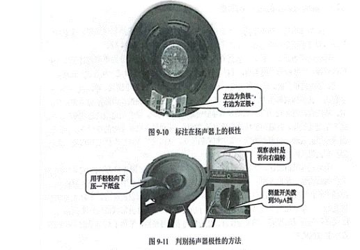 安裝在同一個(gè)音箱中的揚(yáng)聲器,所接極性必須相同。揚(yáng)聲器相位判斷方法如下:揚(yáng)聲器口朝上放置,萬(wàn)用表置于“直流50uA”擋,兩表筆分別接揚(yáng)聲器兩引出端,用手輕輕向下壓一下紙盆。在向下壓的瞬間,如果表針向右偏轉(zhuǎn),則黑表筆所接為揚(yáng)聲器的“+”端,紅表筆所接為揚(yáng)聲器的“—”端,如圖9—11所示。