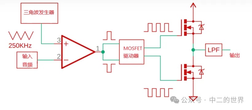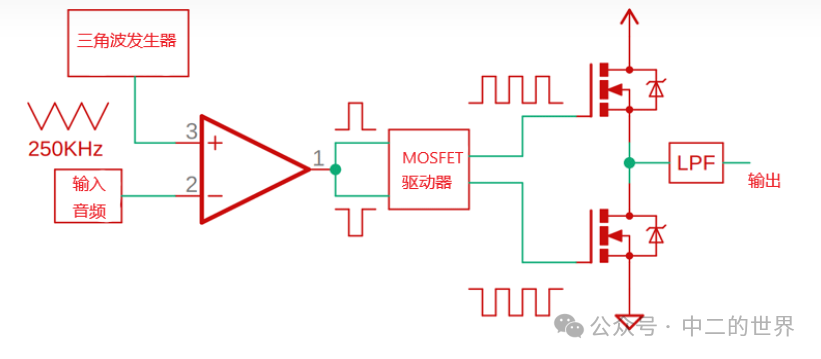 D 類(lèi)放大器原理你在同相端看到的,有音頻輸入; 在反相端,有高頻三角信號(hào)。此時(shí),當(dāng)輸入音頻信號(hào)的電壓大于三角波的電壓時(shí),比較器的輸出變?yōu)楦唠娖剑?dāng)信號(hào)為低電平時(shí),輸出為低電平。有了這個(gè)設(shè)置,我們只是用高頻載波信號(hào)調(diào)制輸入音頻信號(hào),然后連接到 MOSFET 柵極驅(qū)動(dòng) IC,顧名思義驅(qū)動(dòng)器用于驅(qū)動(dòng)兩個(gè)MOSFET 的柵極側(cè)和低側(cè)一次。在輸出端,得到一個(gè)強(qiáng)大的高頻方波,我們通過(guò)一個(gè)低通濾波器來(lái)獲得我們最終的音頻信號(hào)。