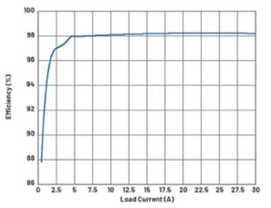 圖3. 在對流冷卻(無空氣流動)情況下,VIN = 24 V時的轉(zhuǎn)換器效率。