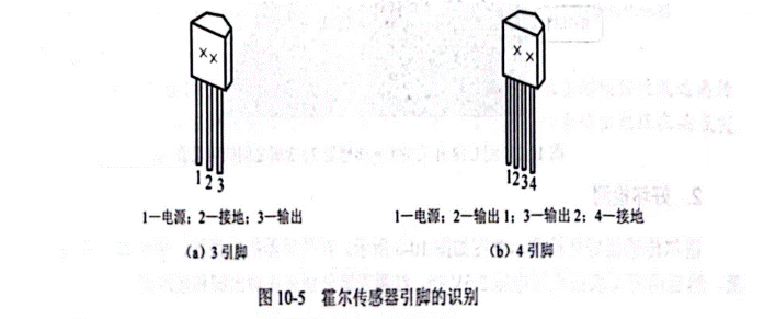 霍爾傳感器對(duì)外引出3個(gè)或4個(gè)引腳,對(duì)于3個(gè)引腳的爾傳感器,分別為電源端、接地端和信號(hào)輸出端;對(duì)于4個(gè)引腳的霍爾傳感器,分別為電源端、接地端和兩個(gè)信號(hào)輸出端。3個(gè)引腳的霍爾傳感器更為常用;魻杺鞲衅鞯囊_可以根據(jù)外形來識(shí)別,具體如圖10-5所示;魻杺鞲衅鲙淖謽(biāo)記的面通常為磁敏面,正對(duì)N或S磁極時(shí)靈敏度。