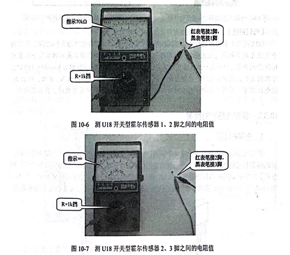 用BM9205型數(shù)字式萬(wàn)用表與MF-47型指針式萬(wàn)用表測(cè)U18開關(guān)型爾傳感器如圖 10-9 所示。
