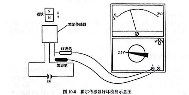 霍爾傳感器好壞檢測(cè)示意圖如圖 10-8所示。在傳感器的電源腳、接地腳之間接 5V電源,然后用萬(wàn)用表?yè)苤绷麟妷?.5V擋,紅黑表筆分別接在輸出腳和接地,再用一塊鐵 靠近霍爾傳感器磁敏面,如果霍爾傳感器正常,應(yīng)有電壓輸出,萬(wàn)手表指針會(huì)擺動(dòng),表針擺動(dòng)幅度越大說明傳感器靈敏度越高。如果表針不動(dòng),則爾傳感器損壞。