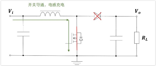 在開關(guān)導(dǎo)通時,電感L接地,二極管截止,輸入電壓Vi對電感L進(jìn)行充電,電感兩端電壓是Vi。
