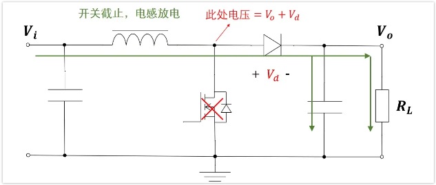 因?yàn)檫@是升壓boost電路,所以Vo+Vd會大于Vi,電感此時放電,給負(fù)載供電,并且給輸出濾波電容充電。