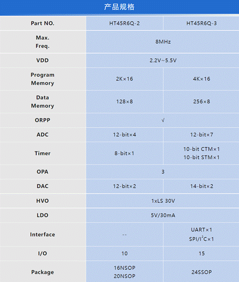 HT45R6Q-2/HT45R6Q-3具有2K/4K×16 OTP Memory、128/256×8 RAM,10/15個多功能I/O引腳。4/7個通道12-bit ADC,用于測量電壓、溫度等信號,另提供一組20/40倍OPA,將電流信號放大,降低電流偵測電阻的電阻值,增加電流判斷精準(zhǔn)度,提高轉(zhuǎn)換效率。