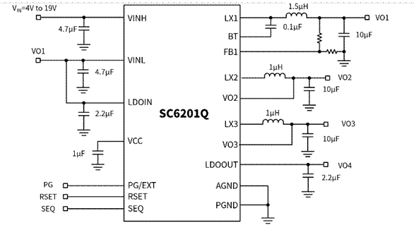 由于生產(chǎn)商的差異,不同車載攝像頭模組的驅(qū)動電壓設(shè)置和序列控制各不相同,需要外部元件配置。SC6201Q 可通過在 SEQ 和 RSET 引腳對地連接不同電阻來配置調(diào)整 CMOS 圖像傳感器的上電時序和模擬供電電壓,系列后續(xù)產(chǎn)品還計劃通過 I2C 接口直接配置,進(jìn)一步減少外部元件數(shù)量,簡化模組電源設(shè)計,讓車載攝像頭模塊更加小巧。