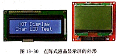 筆段式液晶顯示屏結(jié)構(gòu)簡(jiǎn)單,價(jià)格低廉,但顯示的內(nèi)容簡(jiǎn)單且可變化性小,而點(diǎn)陣式液晶顯示屏以點(diǎn)的形式顯示,幾乎可以顯示任何字符和圖形內(nèi)容。點(diǎn)陣式液晶顯示屏的外形如圖 13-30所示。