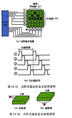 點(diǎn)陣式液晶顯示屏有反射型和透射型之分,如圖13-32所示,反射型LCD屏依靠液晶不透明來(lái)反射光線(xiàn)顯示圖形,如電子表顯示屏、數(shù)字萬(wàn)用表的顯示屏等都是利用液晶不透明(通常為黑色)來(lái)顯示數(shù)字,透射型LCD屏依靠光線(xiàn)透過(guò)透明的液晶來(lái)顯示圖像,如手機(jī)顯示屏、液晶電視顯示屏等都是采用透射方式來(lái)顯示圖像的。