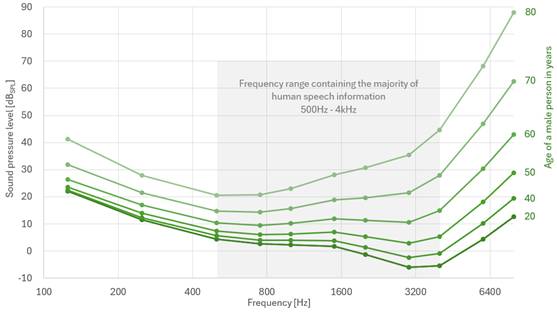 我們大多數(shù)人都知道,人類的聽力閾值會隨著年齡的增長而下降,如圖 2 所示。