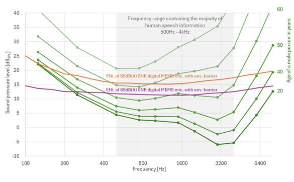 圖 3:中端和高端MEMS麥克風(fēng)的1/3倍頻程等效噪聲級ENL與典型男性聽力閾值的比較