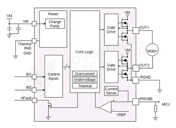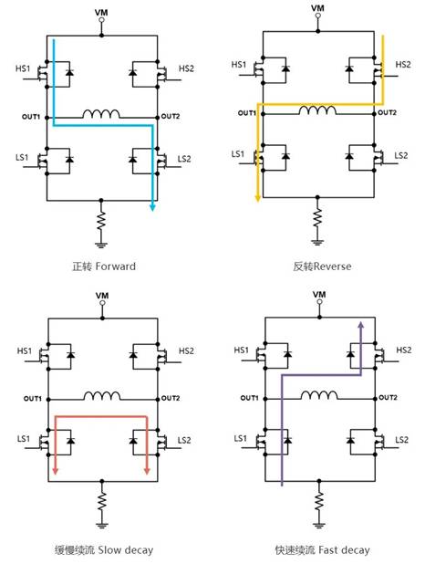 一個(gè)典型的H橋電機(jī)驅(qū)動(dòng)芯片下圖所示,芯片內(nèi)部由四個(gè)MOS管組成H橋(HS1,HS2,LS1,LS2),芯片輸出OUT1和OUT2分別連接直流有刷電機(jī)的兩個(gè)電刷,芯片輸入端與控制單元連接,通過(guò)控制內(nèi)部MOS管的通斷從而控制輸出端與電機(jī)繞組中的電流大小和方向。
