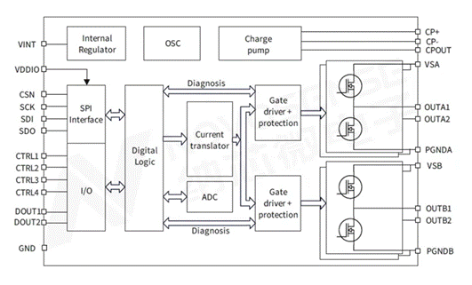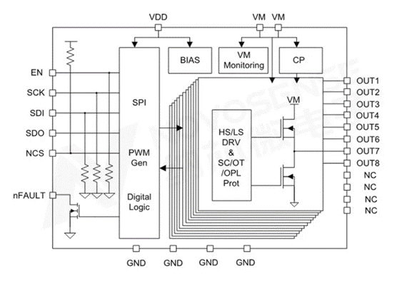 • 提供6/8/10/12通道半橋方案,該系列內(nèi)置8路PWM生成器,僅通過(guò)SPI即可實(shí)現(xiàn)輸出PWM的頻率與占空比配置。