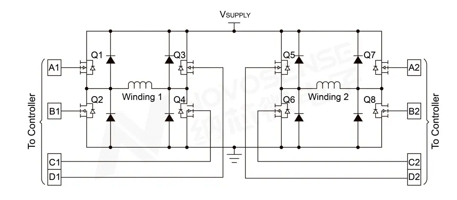 一個(gè)典型的雙極性步進(jìn)電機(jī)驅(qū)動(dòng)芯片內(nèi)置兩個(gè)H橋電路(如下圖所示),輸出分別控制步進(jìn)電機(jī)兩個(gè)繞組的電流方向和大小。
