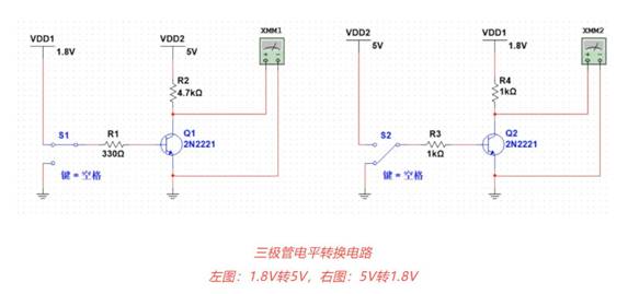 以1.8V轉(zhuǎn)5V為例,當(dāng)開關(guān)S1接到1.8V時,Q1導(dǎo)通,Q1集電極的電壓為0V,當(dāng)S1接地時,Q1截止,Q1集電極的電壓為5V,5V轉(zhuǎn)1.8V也是同理。
