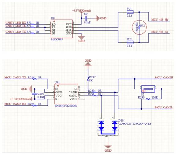 通訊接口的轉(zhuǎn)換非常簡單,直接選用對應(yīng)的通訊芯片就可以了。例如,RS485通訊時可以選擇MAX485,RS232可以用MAX232,CAN可以選SN65HVD230DR,方案基本都是固定的,按照對應(yīng)芯片的數(shù)據(jù)手冊設(shè)計(jì)電路就沒什么問題。