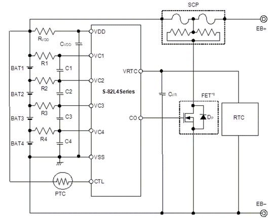 Figure: Example of a protection circuit using the S-82L4 Series