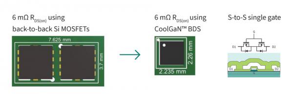 圖6:CoolGaNTM BDS與背對(duì)背硅基MOSFET相比更節(jié)省空間
