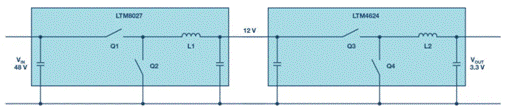圖2. 電壓分兩步從48 V降至3.3 V,包括一個(gè)12 V中間電壓