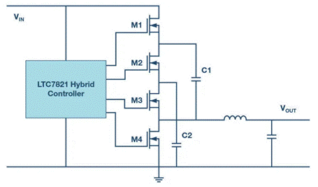 這個(gè)基本問題的另一種解決方案是采用ADI新型混合降壓控制器 LTC7821,它將電荷泵與降壓調(diào)節(jié)結(jié)合在一起。這使得占空比達(dá)到2倍的 VIN/VOUT,因此可以在非常高的轉(zhuǎn)換效率下實(shí)現(xiàn)非常高的降壓比。