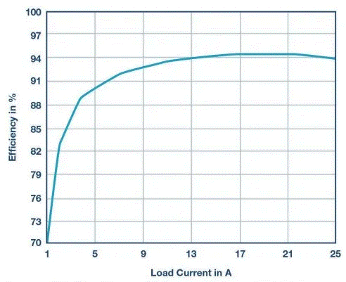 圖4顯示了不同負(fù)載電流下48 V輸入電壓和5 V輸出電壓的典型轉(zhuǎn)換效率。在大約6A時(shí),轉(zhuǎn)換效率超過90%。在13 A和24 A之間, 效率甚至高于94%。