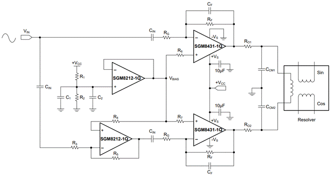 針對(duì)混合動(dòng)力汽車(chē)和電動(dòng)汽車(chē)中電機(jī)驅(qū)動(dòng)器的旋轉(zhuǎn)變壓器勵(lì)磁需求,SGM8431-1Q 以其高電壓和高輸出電流的特性,特別適合于這些應(yīng)用。在這些應(yīng)用中,SGM8431-1Q 能夠有效替代傳統(tǒng)的由運(yùn)算放大器和功率晶體管組成的復(fù)雜旋轉(zhuǎn)變壓器勵(lì)磁驅(qū)動(dòng)器,簡(jiǎn)化系統(tǒng)設(shè)計(jì)。