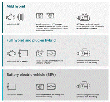 由于車型和平臺(tái)有限,未來(lái)的 BEV 平臺(tái)成為了 OEM 部署 48V 汽車系統(tǒng)的主要目標(biāo)。向電動(dòng)車輛的過(guò)渡也增加了對(duì) HEV 和 PHEV 的投資。圖 1 概述了不同車輛類型之間的差異。