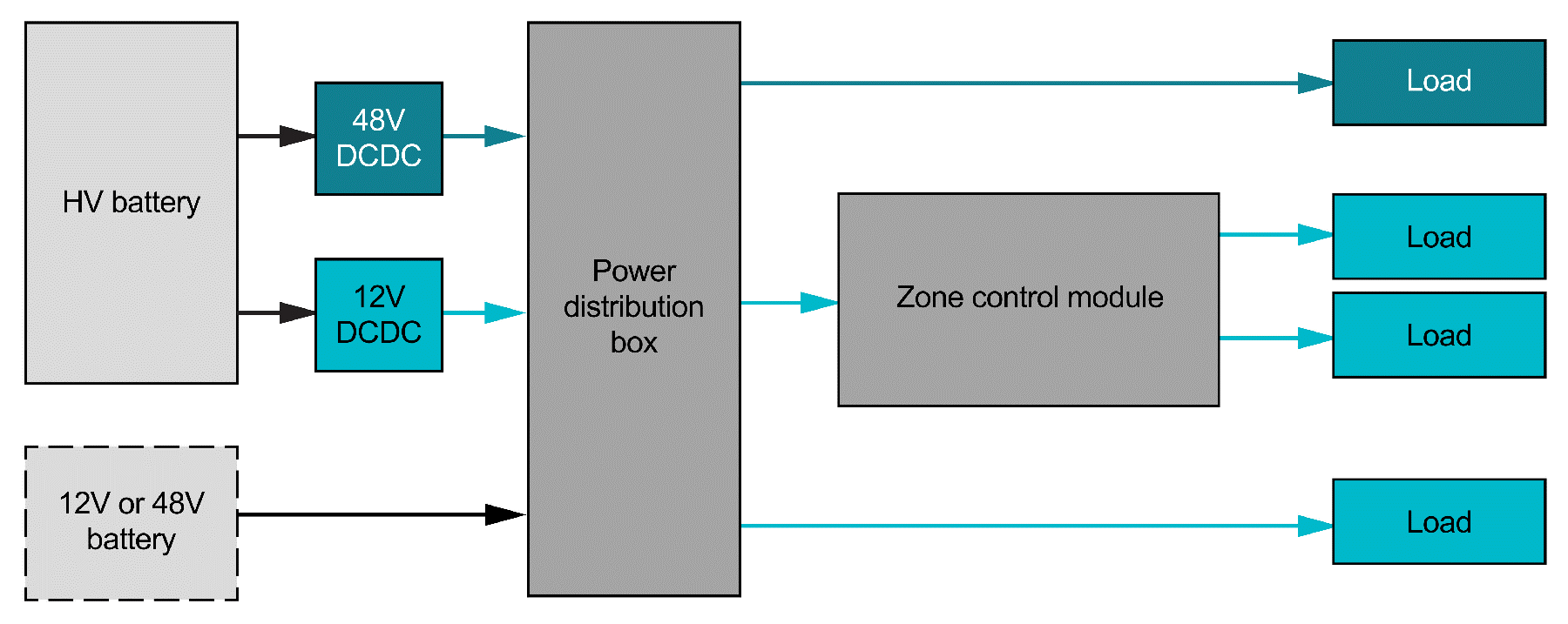 對(duì)于 48V 設(shè)計(jì),破壞性最小的方法是使用 48V 電壓軌為高電流負(fù)載供電,并將其他所有負(fù)載維持在 12V。48V 和 12V 可分配給區(qū)域控制模塊或其他 ECU,但這種方法會(huì)帶來(lái)一些挑戰(zhàn)。兩種不同電壓的分配使線束布線成為一個(gè)關(guān)鍵因素,因?yàn)樵谕痪束中布設(shè) 12V 和 48V 可能導(dǎo)致從 12V 到 48V 系統(tǒng)之間出現(xiàn)短路。對(duì)功能安全的考量也會(huì)增加成本,因?yàn)榭赡苄枰哂嗟?12V 和 48V 電源。