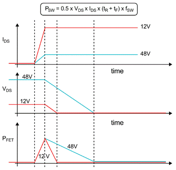 48V 系統(tǒng)的一個(gè)更細(xì)微影響是,雖然有助于減少傳導(dǎo)損耗,但開關(guān)損耗會(huì)增加。這一點(diǎn)在針對(duì)開關(guān)電源轉(zhuǎn)換器(如 DC/DC 轉(zhuǎn)換器和電機(jī)驅(qū)動(dòng)器)的 EMC 測(cè)試中將產(chǎn)生重要影響。將電壓 (VDS) 從 12V 提高到 48V 可以降低電流 (IDS)。但是,如果 48V 系統(tǒng)中的轉(zhuǎn)換率 (tR + tF) 仍與 12V 系統(tǒng)相同,那么功率開關(guān)損耗 (PSW) 將變?yōu)樗谋丁?br>