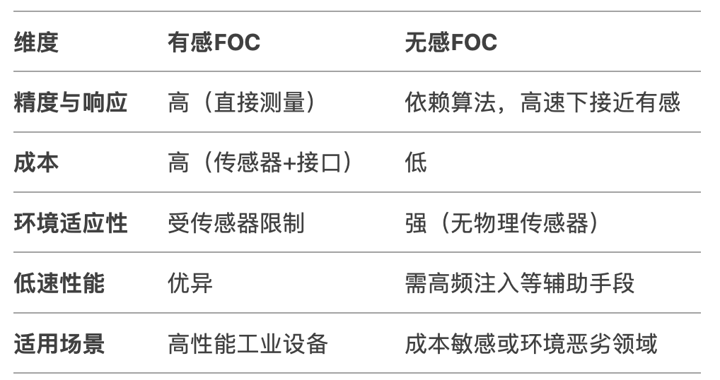 無感 FOC 算法則不需要使用專門的位置傳感器來檢測轉(zhuǎn)子位置,而是通過檢測電機(jī)的相電流、反電動勢或其他電氣量,利用復(fù)雜的算法來估算電機(jī)轉(zhuǎn)子的位置和速度。常見的方法有基于反電動勢法、定子磁鏈法、電感法等,也有采用位置觀測器和反正切或鎖相環(huán)(PLL)計算的組合來構(gòu)成位置觀測算法。無感 FOC 算法同樣是將電機(jī)的電流和電壓進(jìn)行坐標(biāo)變換,在 dq 軸坐標(biāo)系下進(jìn)行控制,但轉(zhuǎn)子位置和速度的獲取是通過對采樣數(shù)據(jù)的計算和分析得到的。這種算法的優(yōu)勢在于降低了系統(tǒng)成本,提高了可靠性和抗干擾性,減少了電機(jī)體積和復(fù)雜度,適用于對成本敏感、安裝空間有限且對控制精度要求不是極高的場合,如家用電器、電動工具、工業(yè)風(fēng)機(jī)等。不過,無感 FOC 算法的缺點(diǎn)是在低速時,由于反電動勢較小,信號檢測和處理難度大,導(dǎo)致估算精度下降,控制性能不如有感 FOC 算法,且算法復(fù)雜度較高,對控制器的計算能力有一定要求。綜上所述,有感FOC和無感FOC之間的對比如下圖所示。
