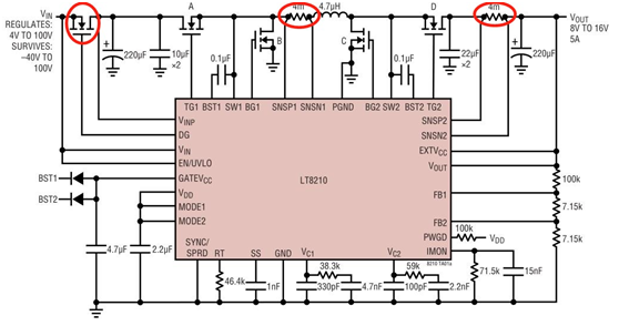 對于電路安全防護(hù)功能,LT8210 芯片在設(shè)計(jì)時(shí)就已經(jīng)充分考慮。如下圖(圖6)所示為較完整的 LT8210 應(yīng)用電路圖,其中紅圈處的設(shè)計(jì),分別實(shí)現(xiàn)了防反接和電流監(jiān)測限制的功能。這些關(guān)鍵器件從前至后串接在電流通路中,由 LT8210 芯片全程采集電壓電流參數(shù)和進(jìn)行相應(yīng)控制。