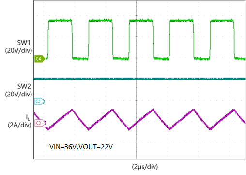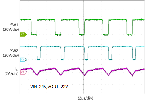 YX22105 能夠根據(jù)輸入輸出電壓自適應(yīng)的進(jìn)入降壓,升壓,升降壓模式;同時(shí)保證模式切換時(shí)具有優(yōu)異的暫態(tài)性能,使輸出的過沖、跌落風(fēng)險(xiǎn)降到最低。