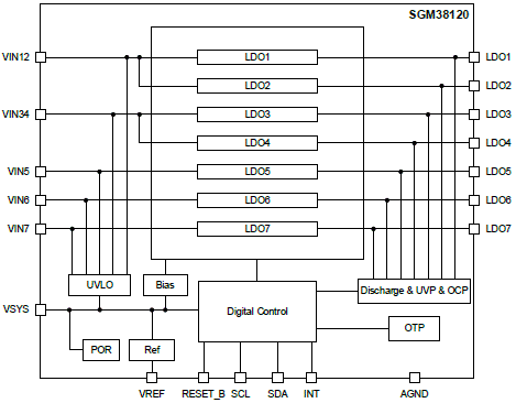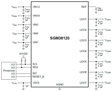 SGM38120 是一款高性能的 7 通道低壓差線性穩(wěn)壓器(LDO)電源管理集成電路(PMIC),集成了兩種類型的 LDO 通道:兩個低壓差 N 溝道 MOSFET LDO 通道和五個高電源噪聲抑制比(PSRR)及低噪聲 P 溝道 MOSFET LDO 通道。這種設(shè)計使其能夠滿足多種電源管理需求,同時兼顧高效性和穩(wěn)定性。