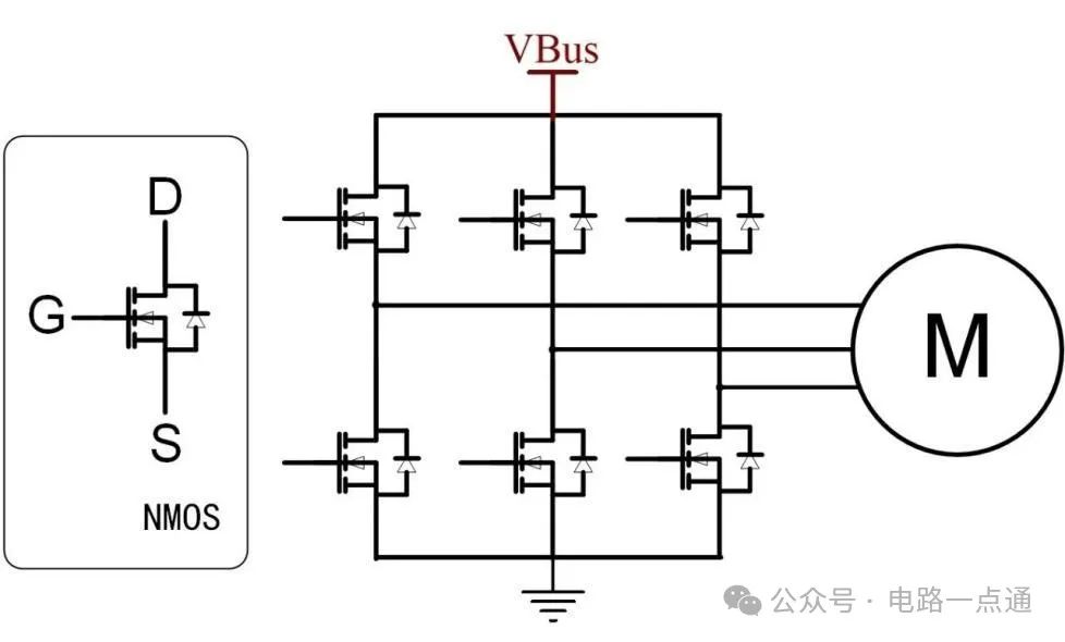 BLDC 的功率級驅(qū)動電路通常由 6 個 N 溝道功率 MOS 管構(gòu)成三相全橋。這 6 個 MOS 管分為兩組,三個高邊 MOS 連接電源正極(VBus),三個低邊 MOS 連接電源負(fù)極。通過控制 MOS 管通斷,實現(xiàn)電流在電機繞組中分配,推動電機運轉(zhuǎn)。