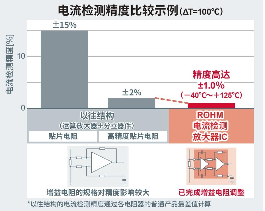 新產(chǎn)品將以往運放+分立器件的運放電路方式進行一體化封裝,更加節(jié)省空間,僅通過連接分流電阻器即可進行電流檢測。另外,新產(chǎn)品采用兩級放大器結(jié)構(gòu),輸入級采用斬波放大器*3,后級采用自穩(wěn)零放大器*4,通過在IC內(nèi)部匹配決定增益精度的電阻,不僅可抑制溫度變化的影響,還可實現(xiàn)±1%的高精度且穩(wěn)定的電流檢測。