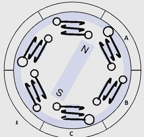 當電流通過線圈時,會產(chǎn)生磁場,而磁力線的方向則取決于電流的方向。利用這一原理,如果給線圈A通入電流,它會產(chǎn)生磁場并吸引轉子磁鐵,使轉子磁鐵沿順時針方向略微偏移并與A對齊。接著,如果依次使電流流過線圈B和C,轉子磁體將連續(xù)沿順時針方向旋轉。