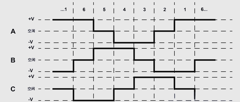 為了確保轉子磁鐵能夠完成完整的360度旋轉,我們可以靈活運用線圈A、B和C的六種不同組合,這些組合在以下的時序圖中得到了清晰的展示。