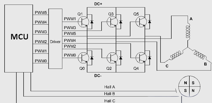 該驅動電路,常被稱作電子速度控制器系統(tǒng)或簡化為ESC,其中一種典型的配置為全橋驅動電路。它包含一個具備PWM輸出的MCU,以及為定子繞組三相服務的六個MOSFET。此外,霍爾傳感器的反饋和電源相關組件也是這一系統(tǒng)的重要組成部分。