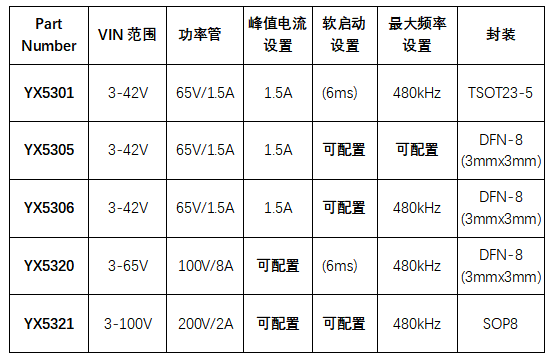 YX5321系列包括不同輸入電壓,以及集成不同導(dǎo)通電阻的功率管,以滿足客戶不同功率等級(jí)需求,為各個(gè)應(yīng)用場(chǎng)景提供最優(yōu)解決方案。