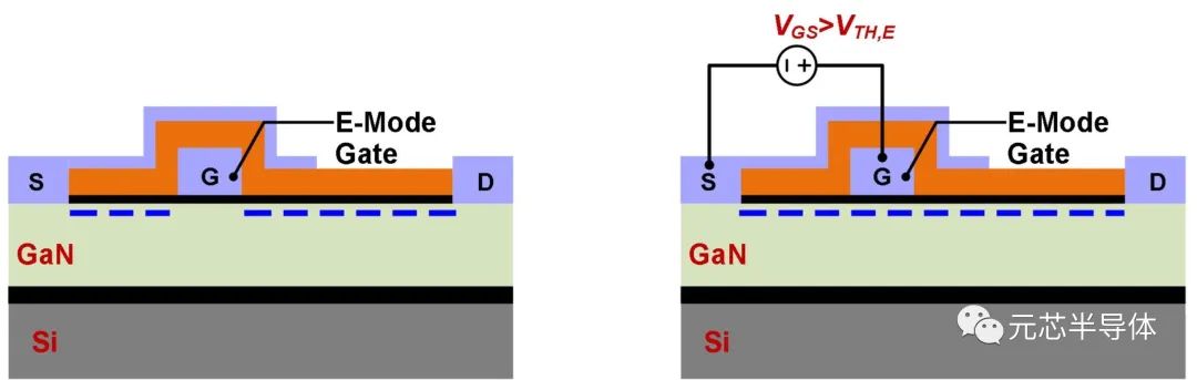 為了緩解驅(qū)動(dòng)的問題,科學(xué)家發(fā)明了增強(qiáng)型 GaN 晶體管,它不需要負(fù)柵極電壓來關(guān)閉晶體管而只需要零電壓,因此簡(jiǎn)化了柵極驅(qū)動(dòng)電路的設(shè)計(jì)。圖 3 顯示了增強(qiáng)型 GaN 晶體管的物理結(jié)構(gòu)。如圖 3(a) 所示,在柵極偏置電壓為零時(shí),GaN晶體管導(dǎo)電溝道保持關(guān)斷狀態(tài),而不是耗盡型 GaN 晶體管的常開狀態(tài)。為了能開通 GaN 晶體管,需要施加正的柵極偏置電壓 VGS,將電子吸引到 AlGaN 和 GaN 的邊界以形成高遷移率導(dǎo)電溝道,從而實(shí)現(xiàn)了一個(gè)正的開啟閾值電壓(典型值約為1.7V)。當(dāng) VGS 高于開啟閾值電壓 (VGS>VTH, E) 時(shí),增強(qiáng)型 GaN 晶體管開通,如圖 3(b) 所示。此外,為了防止 GaN 晶體管發(fā)生破壞性柵極擊穿,施加的最大柵極電壓需要進(jìn)行鉗位,元芯半導(dǎo)體提供了獨(dú)有的專利鉗位和保護(hù)技術(shù),極大的提高了器件和系統(tǒng)的可靠性和穩(wěn)定性。