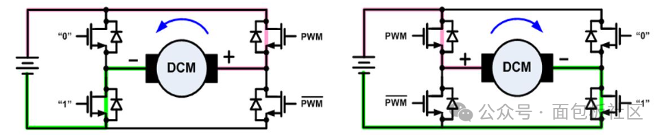 如果需要控制速度、扭矩和方向,則采用由電子開關(晶體管、IGBT或MOSFET)組成的“ H橋”來驅動電機向任一方向旋轉。施加到電機上的電壓可以是任一極性,它使電機沿不同方向旋轉。而通過調制開關脈沖的寬度可以控制電機的速度或扭矩。